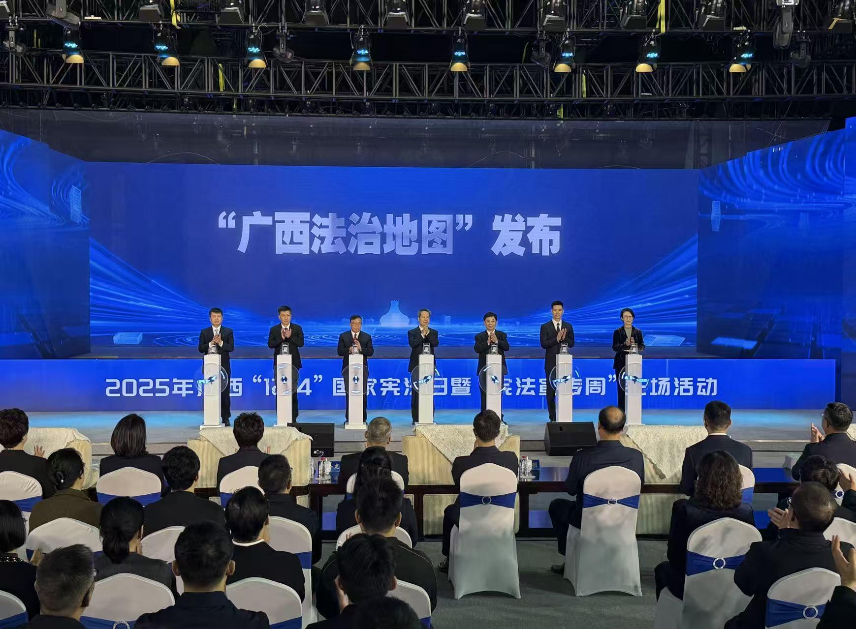 当天的主场活动丰富多彩亮点纷呈。《平安中国2025——同心共筑·与法同行》大型融媒体行动广西南宁站开播;广西全民普法40周年AI 微电影首映;面向少儿的普法读物《与法童行:给孩子的法律故事书》发布;广西普法AI数字人“壮壮”发布,并通过互动演示生动呈现了AI法律知识问答、AI生成普法山歌、以案释法案例等一系列智能普法功能;“广西法治地图”发布,集中展示了广西各设区市的全国民主法治示范村与部分法治宣传教育基地,直观呈现基层依法治理的扎实成效。