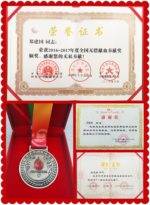 郑建国,1997年至今,始终坚持每年参加无偿献血,于2018年获得国家卫生健康委员会、中国红十字总会、中央军委后勤保障部卫生局联合颁发的“2016~2017年度全国无偿献血奉献奖铜奖”,以及南宁市证书奖章若干。因在抗击新冠肺炎疫情中积极献血,还荣获了南宁献血委感谢状。