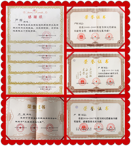 严辉,自1996年以来,坚持无偿献血24年,荣获三次各部委联合颁发的国家级无偿献血奉献奖,其中两次金奖、一次银奖。2020年,严辉荣获南宁市“五星级献血之星”荣誉证书及奖章。他还因在抗击新冠肺炎疫情期间积极献血,荣获六张南宁献血委感谢状。此外,严辉于2005年加入造血干细胞志愿捐献者资料库,是广西造血干细胞捐献事业的光荣先行者。