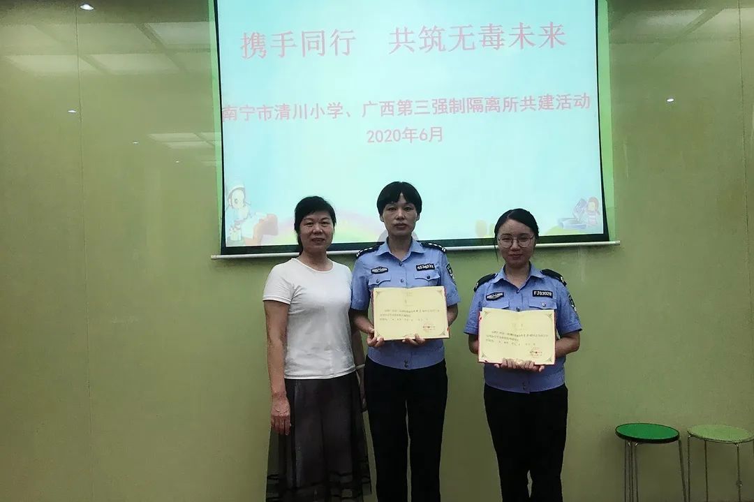 6月24日下午,在国际禁毒日即将来临之际,广西第三强制隔离戒毒所一行四人前往南宁市清川小学开展共建活动,加强对青少年群体的禁毒宣传教育,营造浓厚的禁毒氛围。