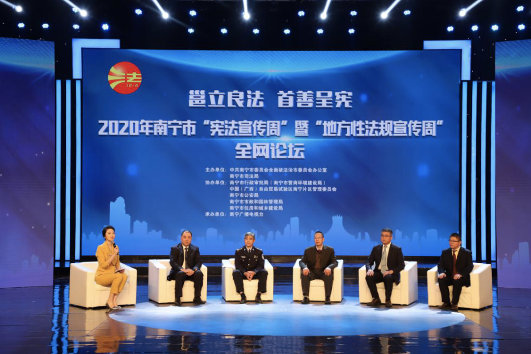 启动仪式结束后,地方性法规宣传南宁全网论坛随之拉开帷幕,论坛以地方性法规宣传为主题,围绕今年广西和南宁新颁布实施的地方性法规进行主旨演讲,畅谈宣传情况、执法成效,并现场答复网友在直播中提出的具有代表性的问题,将现场气氛不断推向高潮。