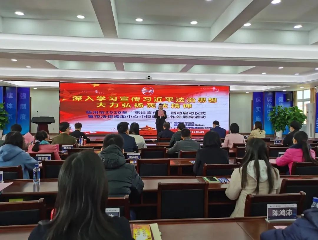 近日,梧州市举行了“深入学习宣传习近平法治思想 大力弘扬宪法精神”的“宪法宣传周”活动启动仪式暨市法律援助中心中恒集团工作站揭牌活动,拉开了梧州市2020年“宪法宣传周”的活动序幕。