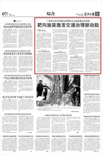 与此同时,广西各执法机构深化“放管服”改革,主动转变执法理念,以专项整治“小切口”推动执法理念更新、执法方式优化、寓服务于执法的“大整治”,把党的制度优势转化为治理效能,推动探索符合广西实际的法治建设途径,激发壮美广西交通治理新动能。