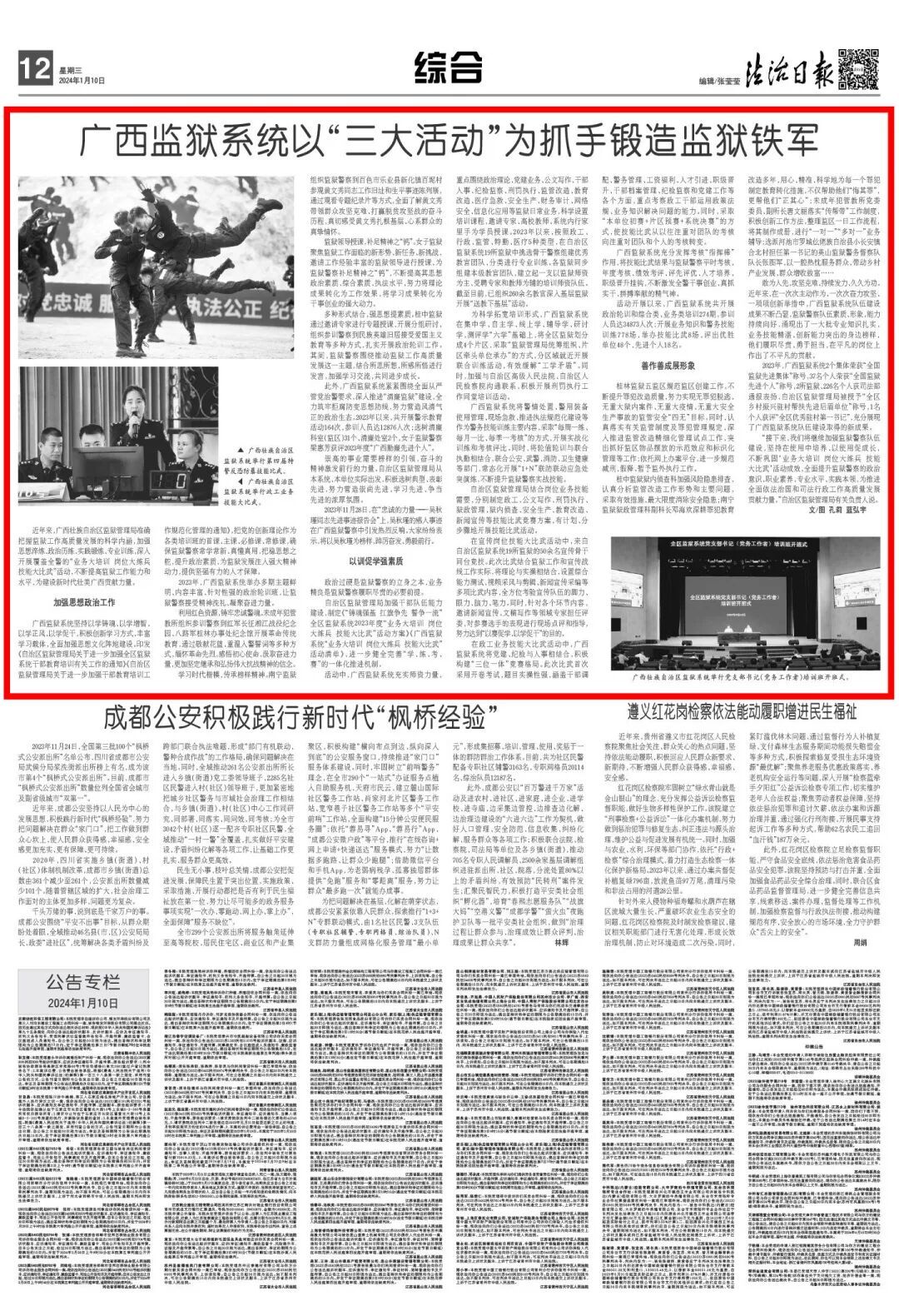 桂中监狱狱内侦查科加强风险隐患排查,认真分析监管改造工作形势和主要问题,采取有效措施,最大限度消除安全隐患;南宁监狱狱政管理科副科长邓海欢深耕罪犯教育改造多年,用心、精准、科学地为每一个罪犯制定教育转化措施,不仅帮助他们“悔其罪”,更帮他们“正其心”;未成年犯管教所党委委员、副所长唐文丽落实“传帮带”工作制度,积极创新工作方法,整理监区一日工作流程,将其制作成册,进行“一对一”“多对一”业务辅导;选派河池市罗城仫佬族自治县小长安镇合北村担任第一书记的英山监狱警务督察队队长张图军,以一腔热忱服务群众,带动乡村产业发展、群众增收致富……