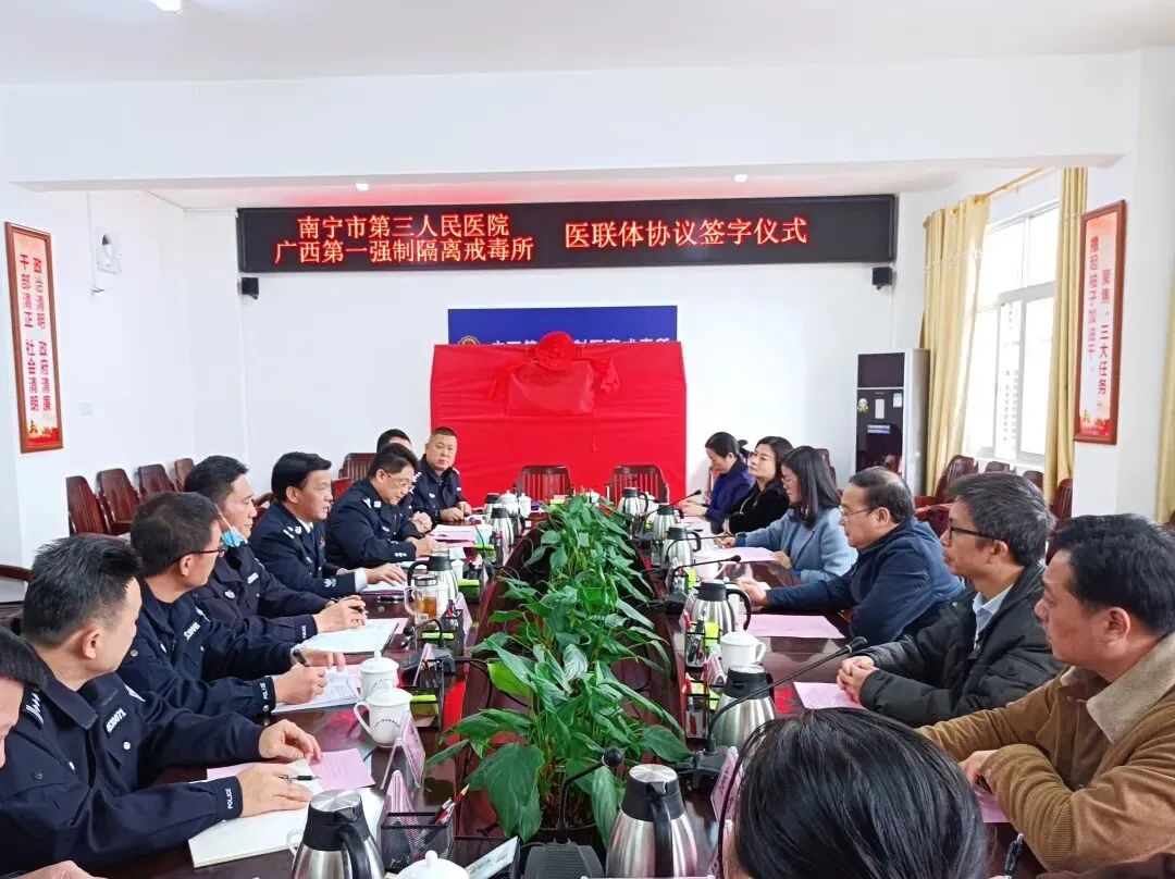 近日,广西第一强制隔离戒毒所与南宁市第三人民医院举行医联体协议签字仪式,进一步深化合作,实现资源优化配置和互补共享,切实解决场所医疗资源匮乏、技术力量薄弱、医疗服务水平不高等问题,进一步推动戒毒医疗工作发展。(卢珩)