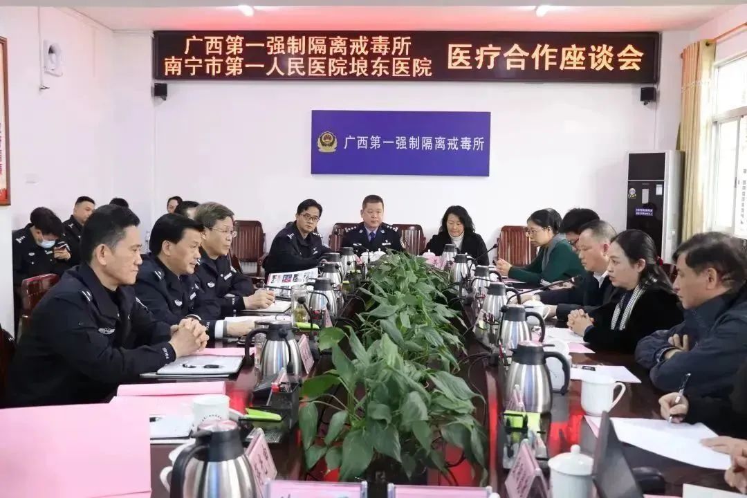 近日,广西第一强制隔离戒毒所与南宁市第一人民医院琅东医院召开医疗合作座谈会,就医联体建设、远程会诊、医药科研、带教帮扶、健康服务等深入交流,进一步深化合作,提升场所医疗技术水平,保障场所医疗安全。(卢珩、陈李双、何国辉)