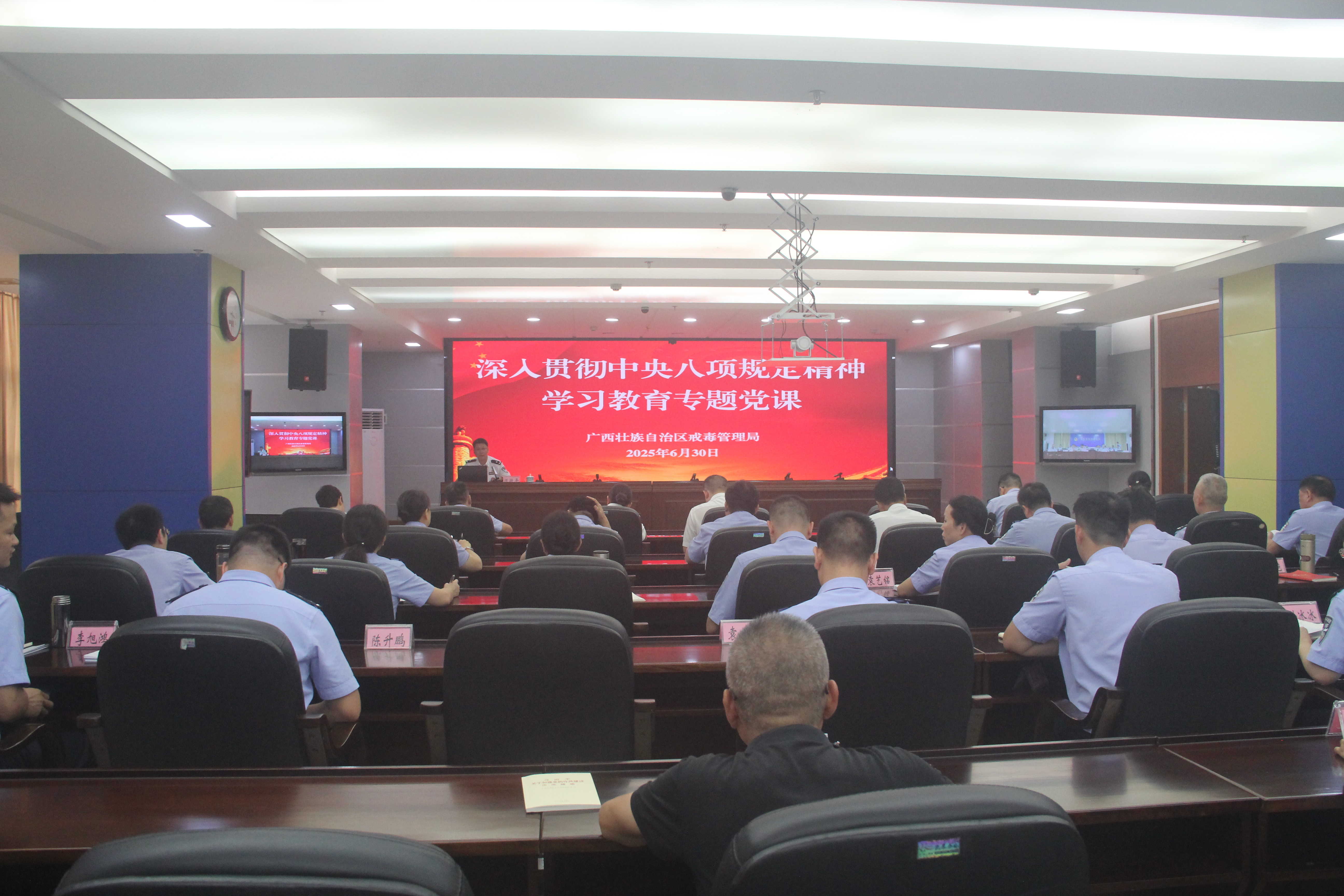 自治区戒毒管理局党委书记、局长陈振平为全体党员上党课,深刻阐释开展深入贯彻中央八项规定精神学习教育的重要意义,结合戒毒工作实际,引导党员时刻绷紧纪律之弦,做到自省自律,以作风建设新成效奋力开创司法行政戒毒事业发展新局面。
