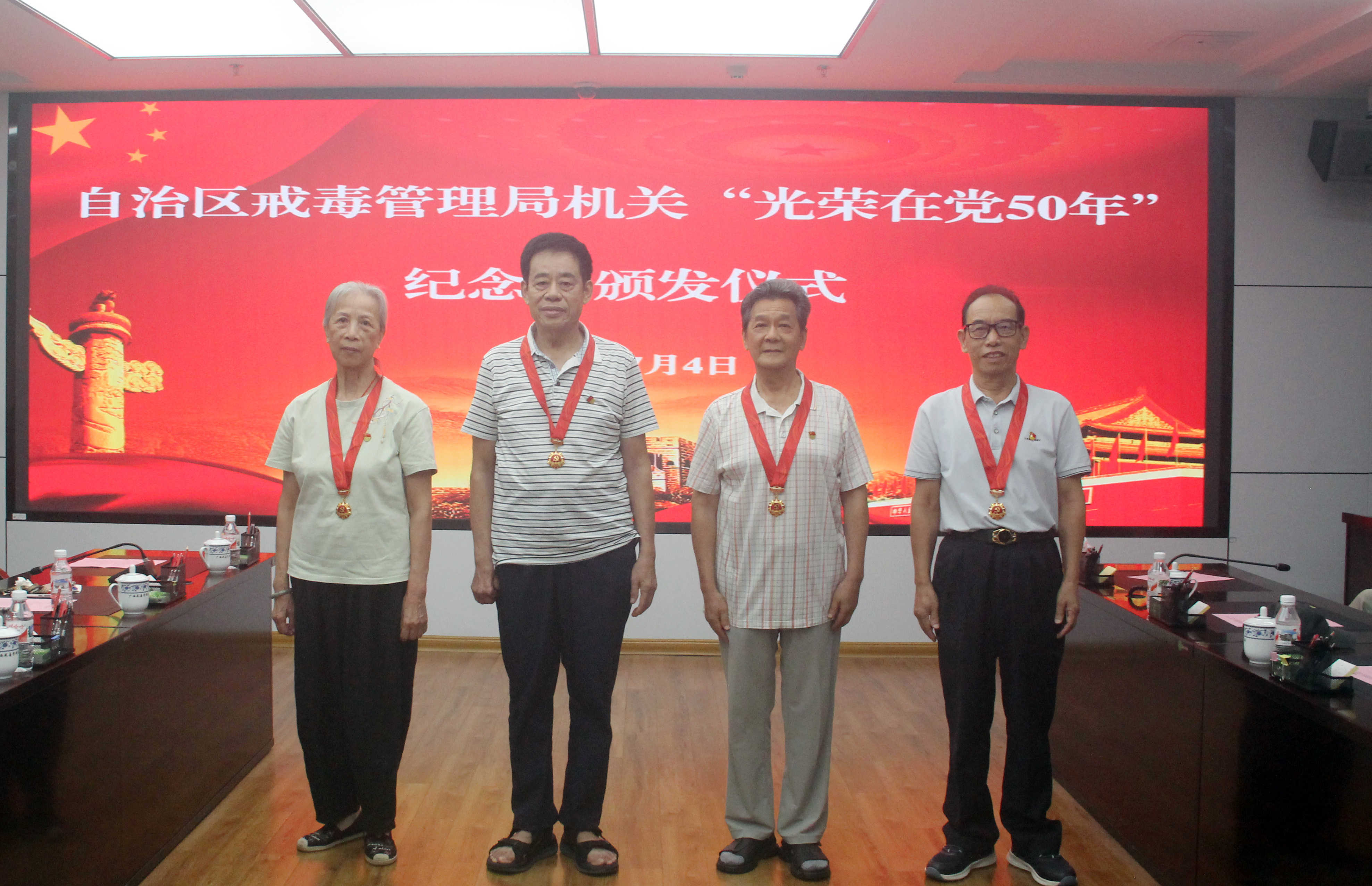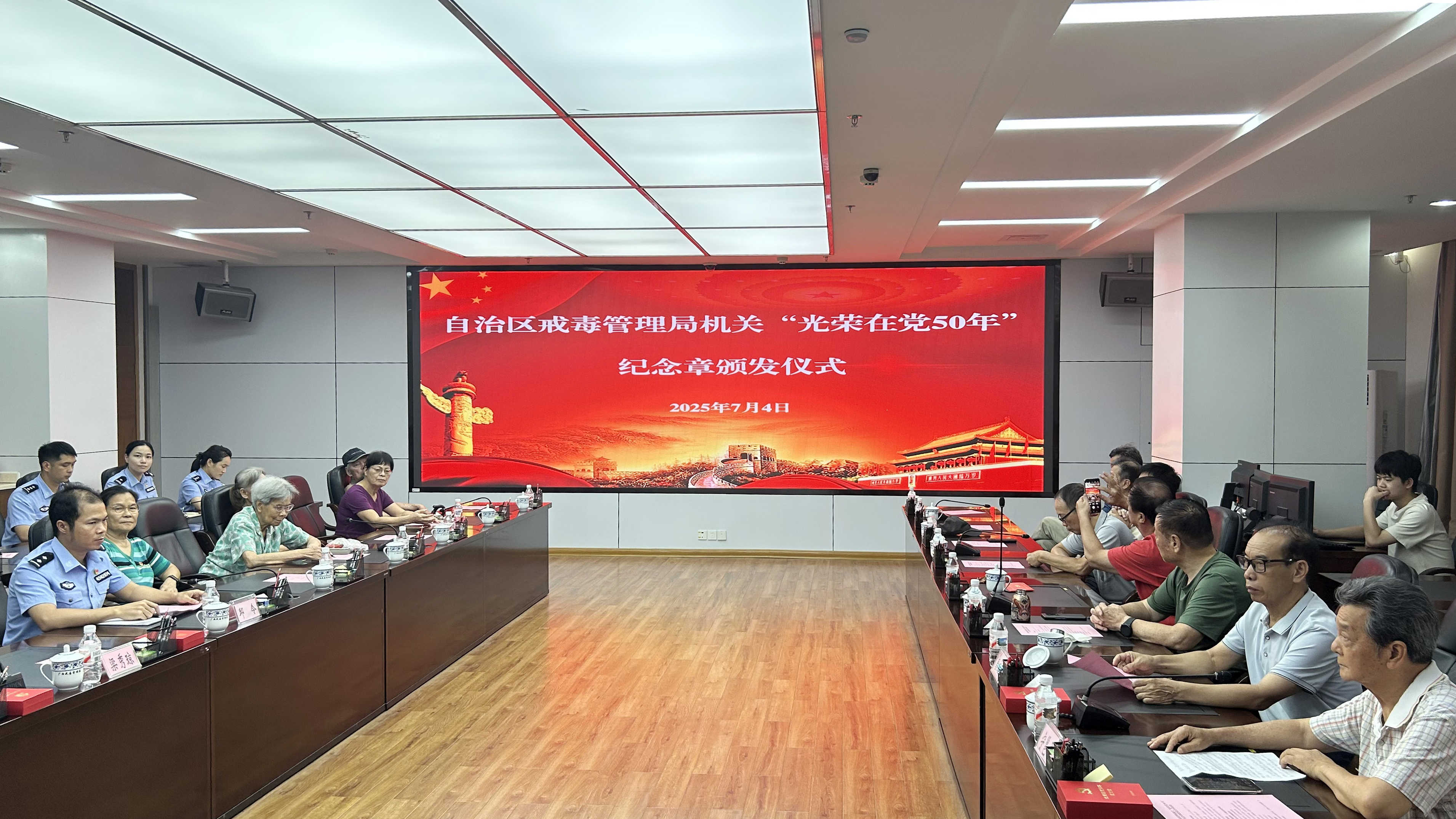 为庆祝中国共产党成立104周年,传承发扬党的光荣传统和优良作风,7月4日,自治区戒毒管理局举办局机关“光荣在党50年”纪念章颁发仪式。