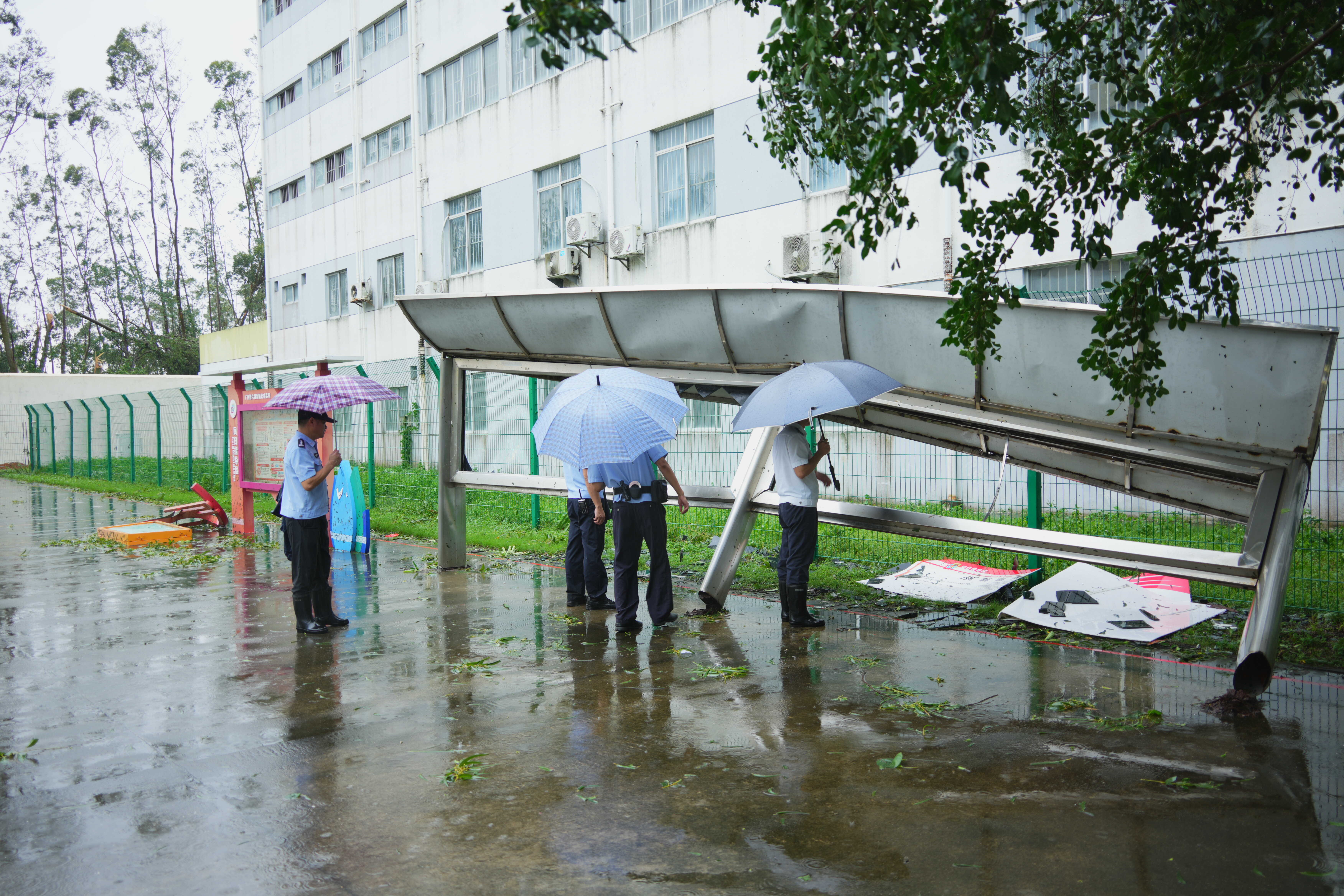 与台风鏖战一夜未合眼的警察们,来不及休整,又顶着风雨投入清理工作。他们身披雨衣,蹚过积水,在摇摇欲坠的树木间穿梭,抢通道路、清理杂物、检修设备、全面消毒。雨衣外是雨水,里面是汗水,人人衣衫湿透。不到一个上午,所内秩序全面恢复。