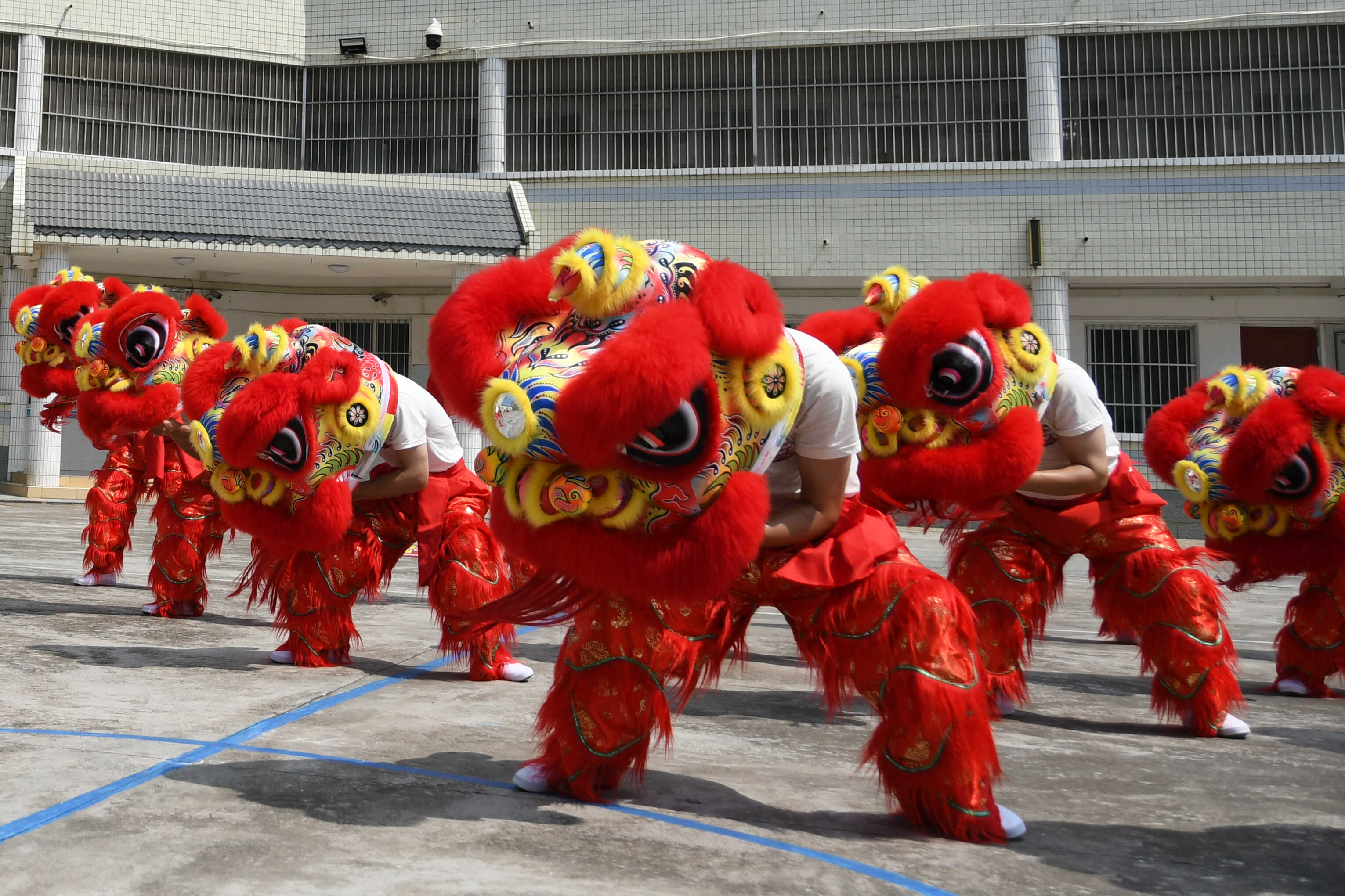 锣鼓声起,彩狮腾跃。在广西第二强制隔离戒毒所的训练场上,红、黄两色的大醒狮随鼓点跃动,时而俯身探路,时而腾空而起,连贯完成三拜、高抛、小跑等传统动作。大醒狮的后方,40只小醒狮组成方阵,跟随节奏踮脚、甩臂、转体,动作整齐划一、姿态活灵活现。