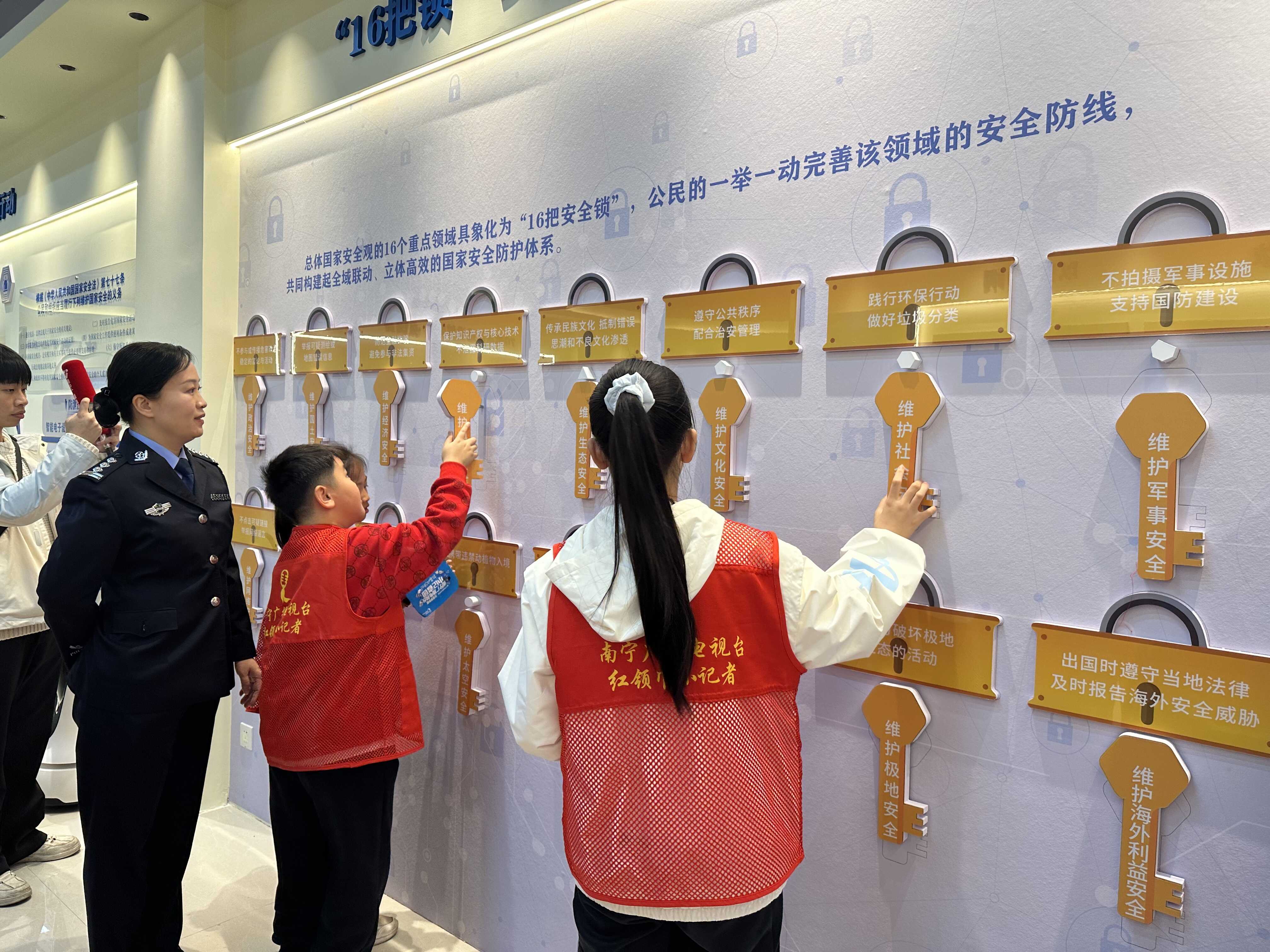在女所警察的带领下,小记者们依次参观法治教育基地和禁毒教育基地。“旅游打卡隐藏风险”板块通过列举近几年发生的因网络分享不慎造成的失泄密案例,告诫同学们增强国家安全意识,提高警惕、遵纪守法。极具特色的“16把锁”安全防护体系展览墙直观展现了总体国家安全观的16个重点领域。同学们纷纷表示,互联网不是法外之地,要不断提高法律意识和网络安全意识,自觉做国家安全的捍卫者。