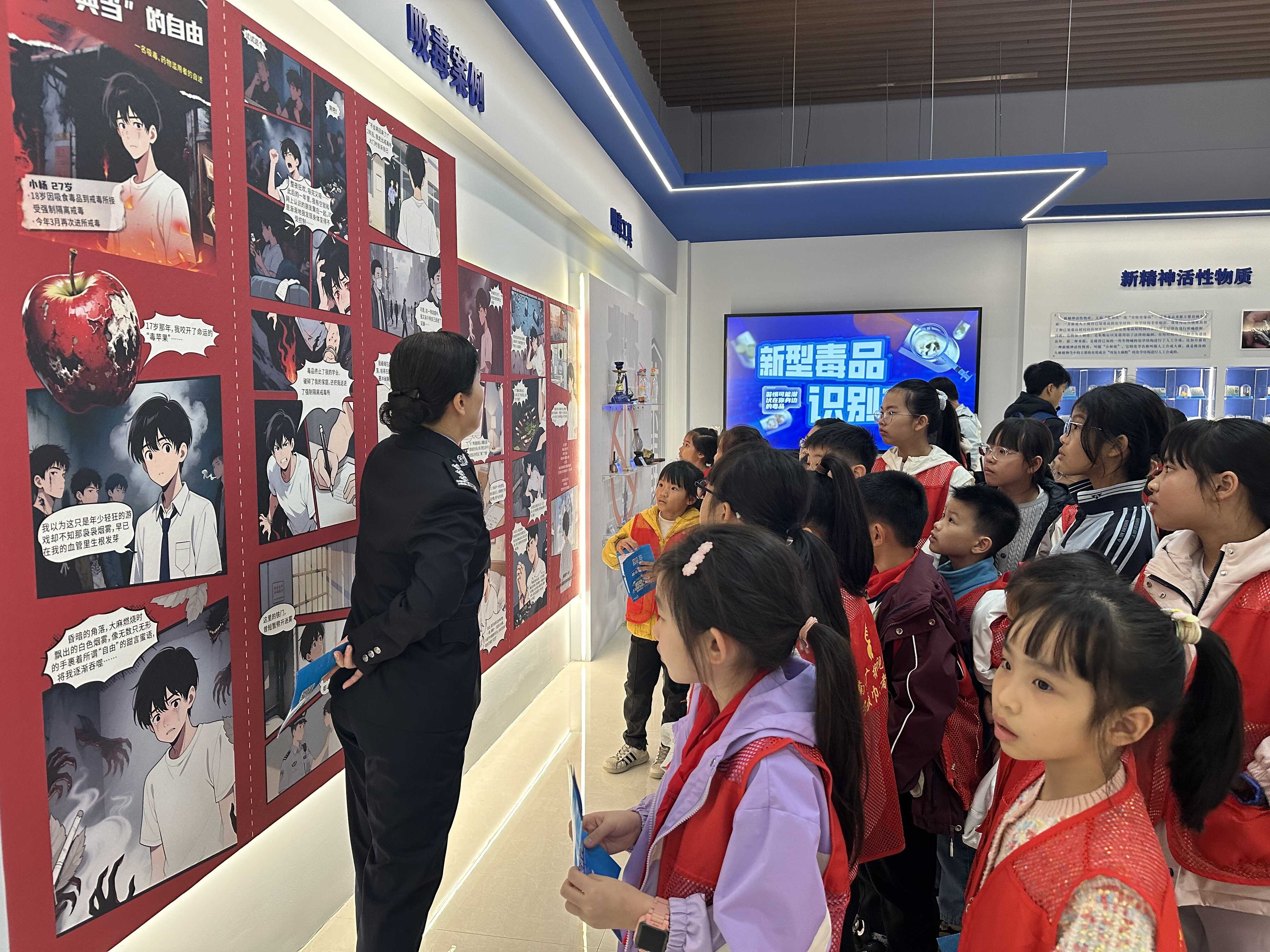 在禁毒教育基地,女所警察结合人体器官与毒品危害关联图,系统讲解毒品对个人、家庭和社会造成的危害,教育引导同学们树立珍爱生命、远离毒品的意识。